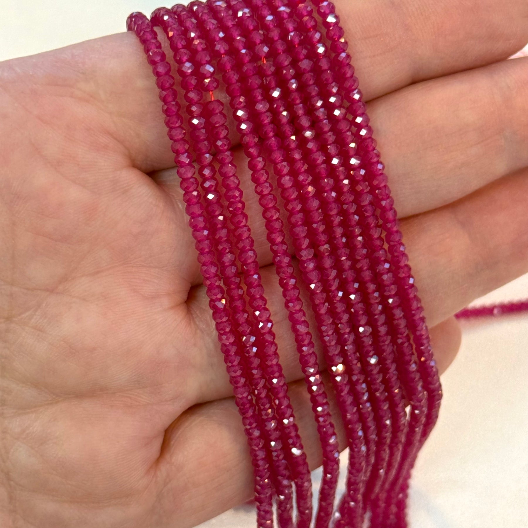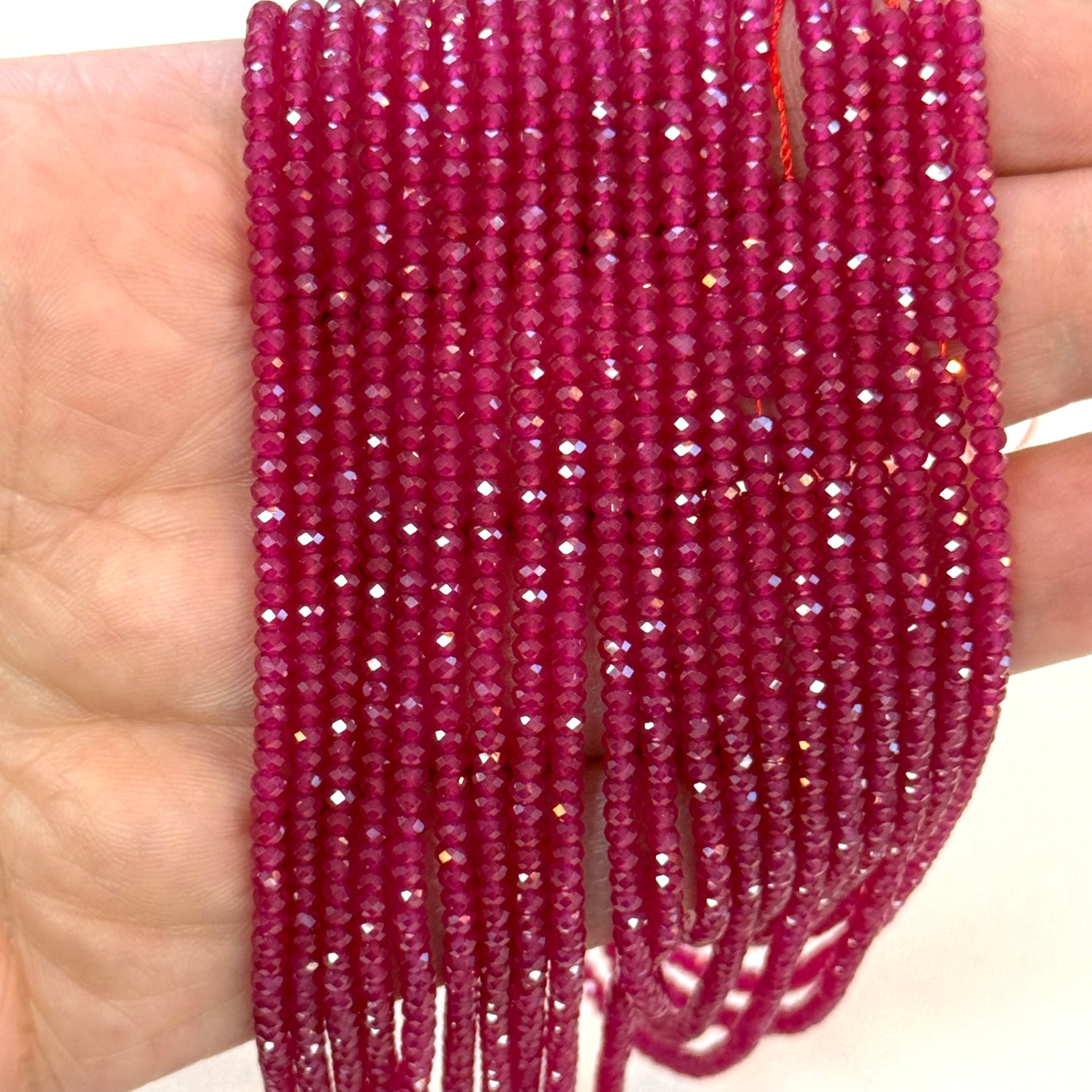 Add a rich pop of pinkish-red elegance to your jewellery designs with these genuine natural ruby beads in a faceted rondelle shape. Each strand measures approximately 15.5 inches and includes around 220 micro-faceted beads, sized approximately 2.5x1.5mm with a hole size of about 0.4–0.5mm.