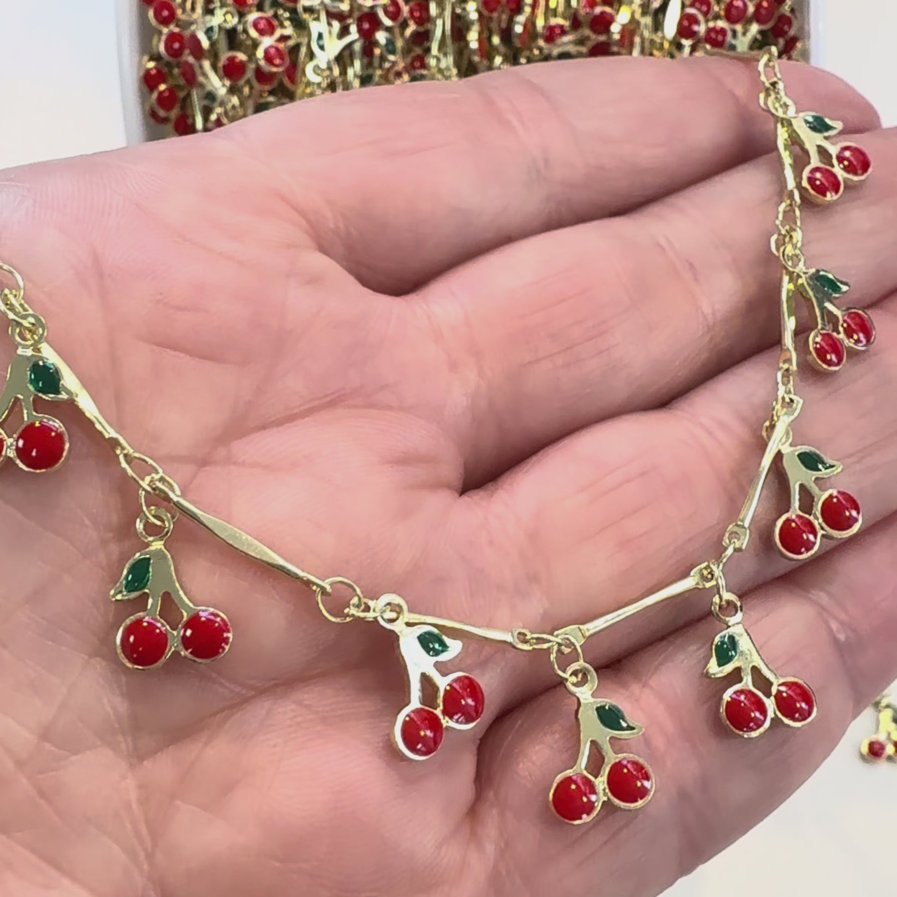 Each cherry charm measures approximately 10 × 8 mm with glossy red enamel and green leaf details, while the brass bars (approx. 15 mm) are finished in rich 24K gold plating for a luxurious look. The charms are evenly spaced along the chain, making it perfect for necklaces, bracelets, anklets, or statement charm jewellery.