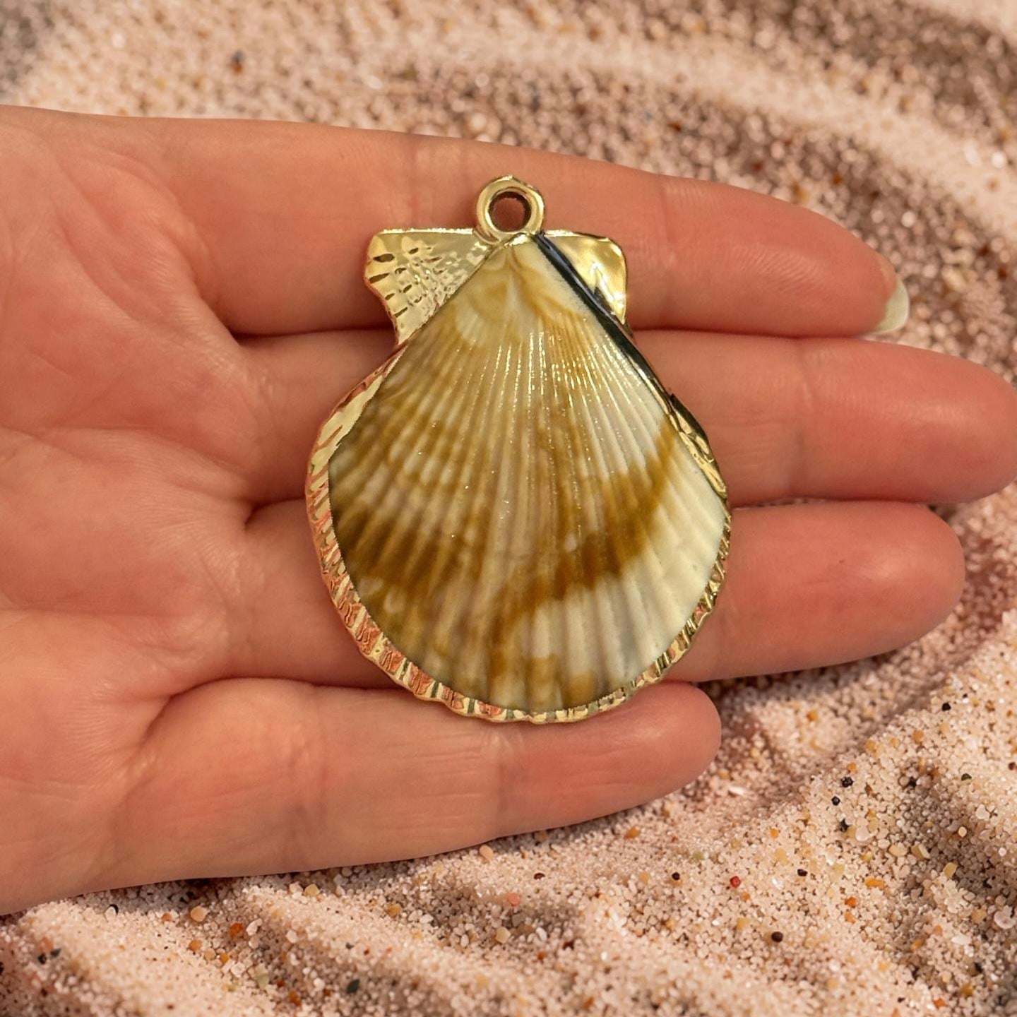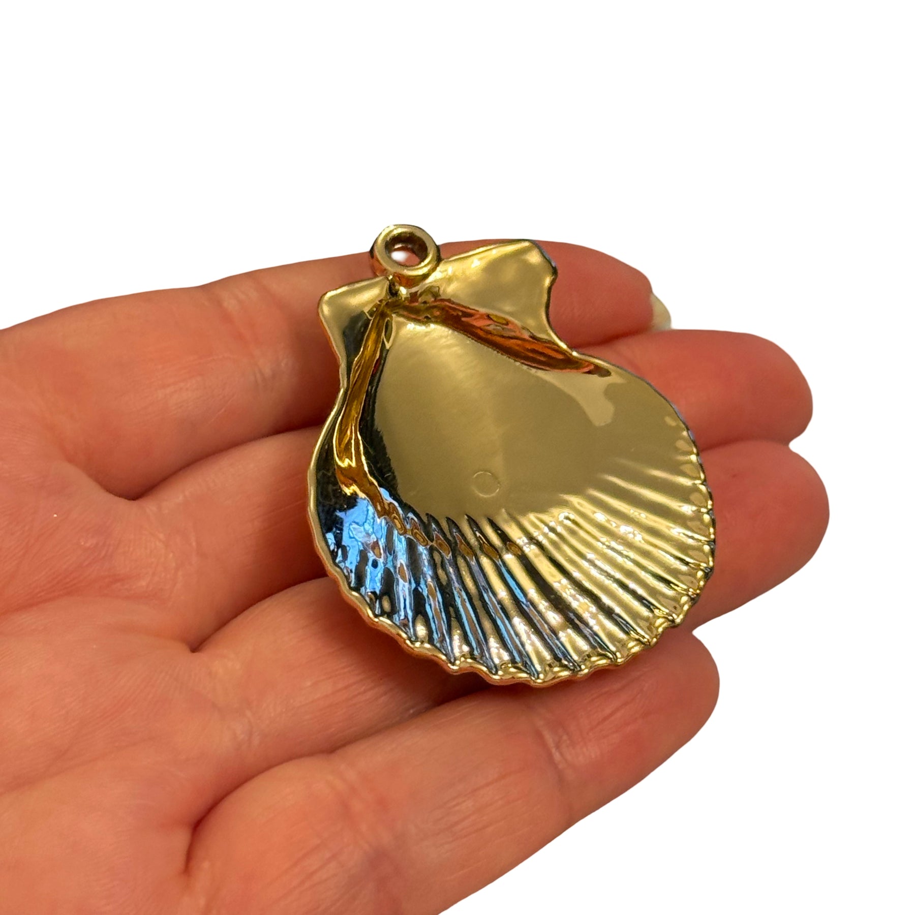 A unique scallop shell pendant featuring a realistic shell texture with elegant 24Kt gold plated detailing. Designed with a side/top drilled hole, giving it a slightly different hanging style compared to standard loop charms.
