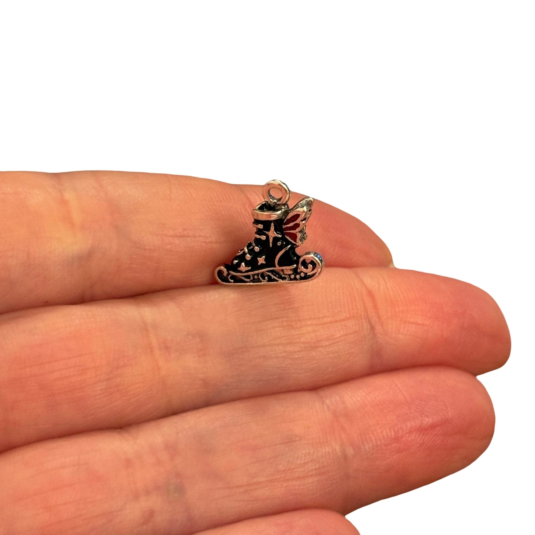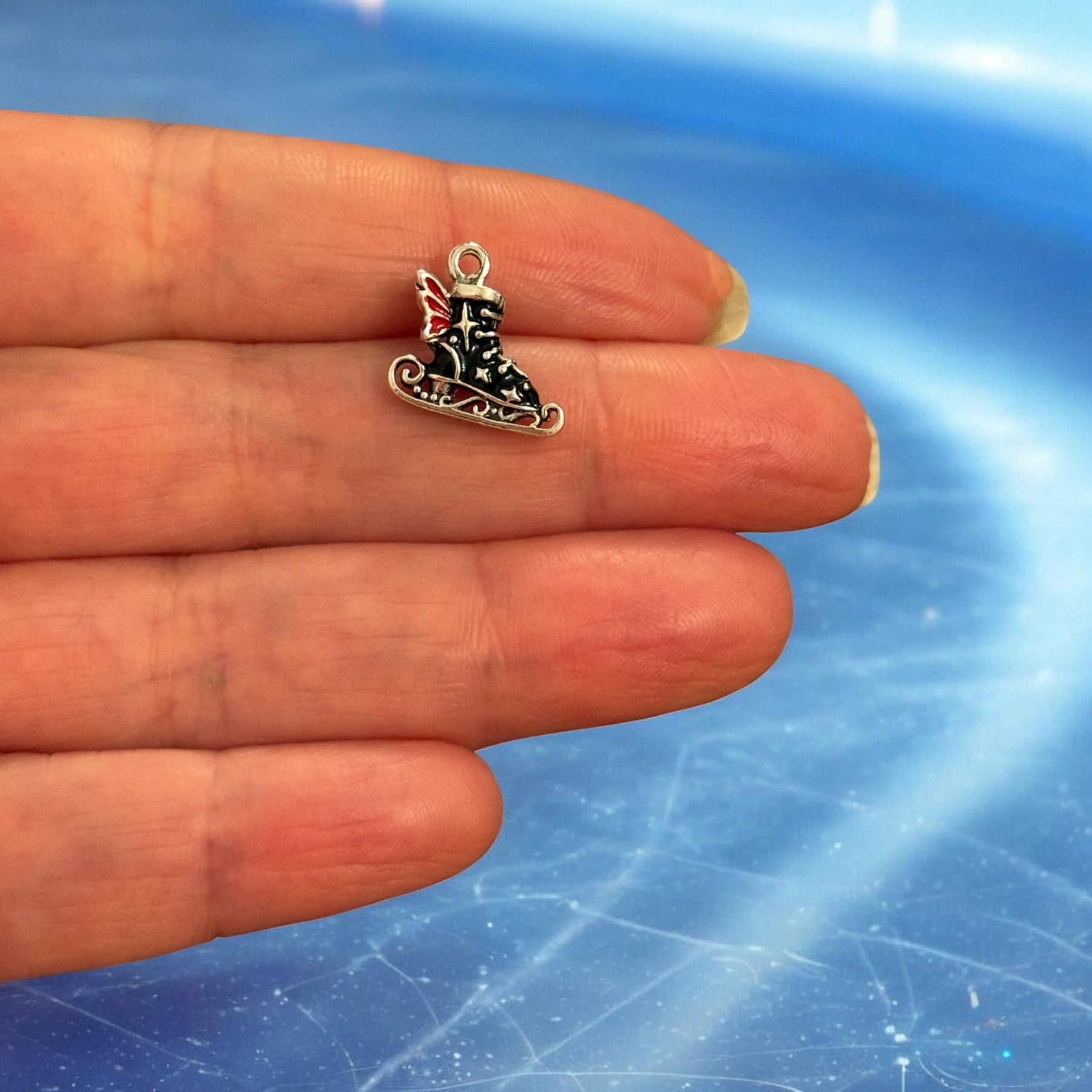 A beautiful winged ice skate charm featuring black enamel details with a delicate silver-tone frame and red wing accent. This whimsical design combines a classic ice skating boot with small decorative wings, giving it a magical winter and fairy-tale feel.