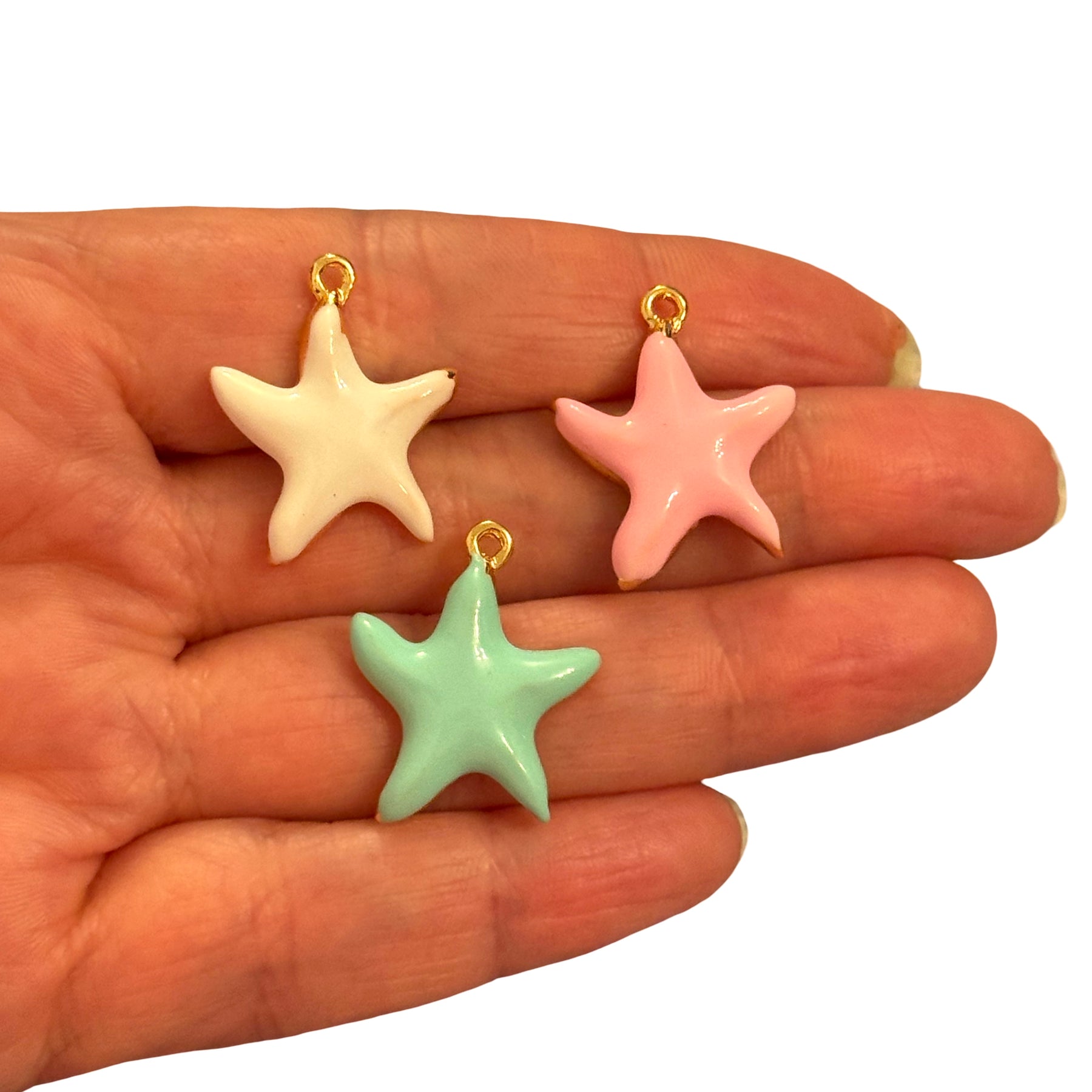 A beautifully shaped white enamel starfish pendant with a smooth glossy finish and delicate gold edging.