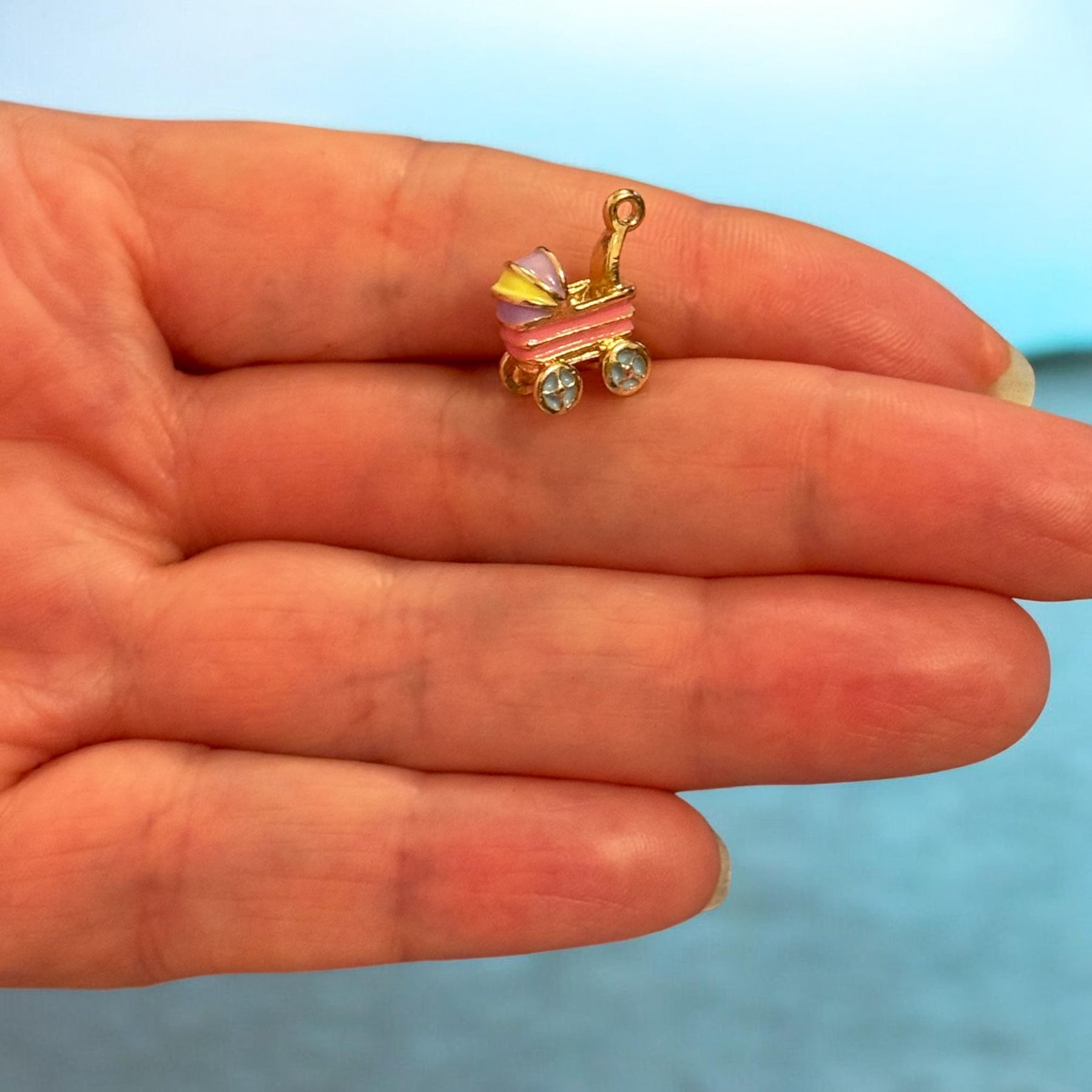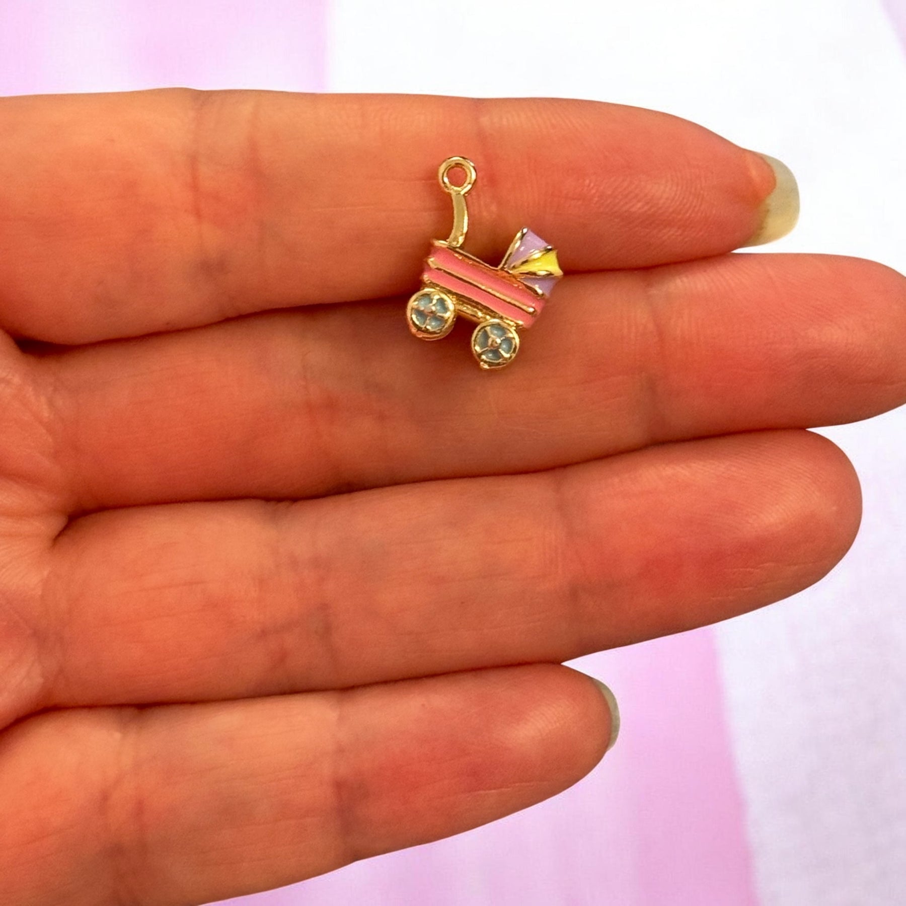 A sweet pink baby stroller enamel charm featuring delicate pastel colours and tiny decorative wheels. This miniature pram charm is perfect for baby-themed jewellery, baby shower gifts, and handmade charm bracelets.